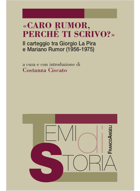 Il volume raccoglie il carteggio, intercorso tra l'agosto del 1956 e il dicembre del 1975, tra Mariano Rumor (Vicenza, 1915-1990) e Giorgio La Pira (Pozzallo, 1904-Firenze, 1977), protagonisti di primo piano, per oltre un cinquantennio, della vita politica italiana: l'uno, deputato veneto all'Assemblea Costituente, ministro di Stato di vari dicasteri (Agricoltura, Interni, Esteri), parlamentare europeo, presidente dell'Unione europea dei democratici cristiani (Uedc) e poi dell'Unione mondiale dei democratici cristiani (Umdc), nonché presidente del Consiglio dei ministri in cinque governi della Repubblica; l'altro: giurista, docente di diritto romano, anch'egli deputato alla Costituente, per tre mandati sindaco di Firenze e presidente della Federazione mondiale delle città unite (Fmcu). La conoscenza di queste fonti, sino a oggi inedite, consente non soltanto di sondare il loro rapporto ma di gettare nuova luce su alcuni snodi cruciali della storia della Democrazia cristiana e, più in generale, dell'evoluzione della democrazia italiana. Introduzione della curatrice.