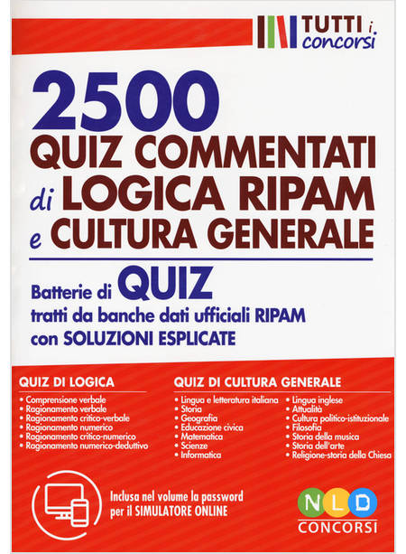 Il volume è composto da 2500 quiz risolti e commentati, sia di logica, prelevati direttamente dalle banche dati ufficiali Formez-Ripam, sia di cultura generale ed è stato pensato per guidare passo dopo passo i lettori. Le soluzioni e le spiegazioni sono sempre poste al termine delle singole batterie di quiz di ciascuna area, proprio al fine di stimolare il concorsista a sviluppare autonomamente le capacità risolutive. Il volume si presenta come un ottimo strumento di brain training, ideale per tutti coloro che desiderano allenare la propria mente, potenziandone elasticità e tempi di reazione, al fine della preparazione in vista delle prove preselettive di numerosi concorsi pubblici. L'opera si apre con una parte introduttiva corredata da istruzioni ed esempi sullo svolgimento dei quiz di logica che compongono il volume. I capitoli successivi sono dedicati ai quiz di logica di comprensione verbale, ragionamento verbale, ragionamento critico-verbale, ragionamento numerico, ragionamento critico-numerico, ragionamento numerico-deduttivo. Conclude il capitolo di ciascuna categoria di quiz la soluzione corretta accompagnata da una spiegazione dettagliata sul corretto svolgimento dei quesiti. Oltre ai quiz di logica, sono presenti nel volume numerosi quiz di cultura generale che comprendono: lingua e letteratura italiana, storia, geografia, educazione civica, matematica, scienze, informatica, lingua inglese, attualità, cultura politico-istituzionale, filosofia, storia della musica, storia dell'arte e religione-storia della Chiesa. Anche per i quiz di cultura generale conclude il capitolo di ciascuna categoria di quesiti la soluzione corretta accompagnata da un commento dettagliato. Ciascun quiz presenta più alternative di risposta, ma soltanto una di esse è corretta, accompagnata. La sola maniera per affrontare al meglio i quiz delle prove attitudinali dei concorsi risulta essere, quindi, l'esercizio assiduo e costante: le variabili di composizione dei quiz sono molteplici e spesso il candidato si trova di fronte tipologie di quiz mai somministrate prima. Dunque, risulta necessario prima di tutto comprendere la tipologia di quiz e poi acquisirne il metodo di risoluzione, in modo da poter risolvere qualunque tipologia ci si trovi a dover affrontare in sede di concorso. Il presente volume si prefigge proprio questo obiettivo.