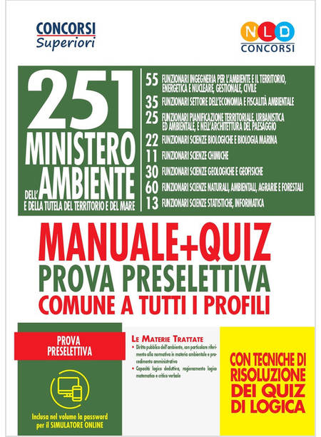 In data 9 agosto 2019, è stato indetto un concorso pubblico, per titoli ed esami, per il reclutamento di complessive n. 251 (duecentocinquantuno) unità di personale non dirigenziale a tempo indeterminato da inquadrare nell'Area III, posizione economica F1, presso il Ministero dell'ambiente e della tutela del territorio e del mare, nella sede unica di Roma, per i seguenti profili: n. 55 (cinquantacinque) funzionari con competenze nel settore dell'ingegneria per l'ambiente e il territorio, energetica e nucleare, gestionale, civile - (Cod. ING/MATTM); n. 35 (trentacinque) funzionari con competenze nel settore dell'economia e fiscalità ambientale - (Cod. ECO/MATTM); n. 25 (venticinque) funzionari con competenze nel settore della pianificazione territoriale, urbanistica e ambientale, e nell'architettura del paesaggio - (Cod. ARC/MATTM); n. 22 (ventidue) funzionari con competenze nel settore delle scienze biologiche e biologia marina - (Cod. BIO/MATTM); n. 11 (undici) funzionari con competenze nel settore delle scienze chimiche - (Cod. CHI/MATTM); n. 30 (trenta) funzionari con competenze nel settore delle scienze geologiche e geofisiche (Cod. GEO/MATTM); n. 60 (sessanta) funzionari con competenze nel settore delle scienze naturali, scienze ambientali, agrarie e forestali - (Cod. NAT/MATTM); n. 13 (tredici) funzionari con competenze nel settore delle scienze statistiche, l'informatica, la società dell'informazione - (Cod. INF/MATTM). Lo svolgimento della prova d'esame consiste in una prova preselettiva, comune a tutti i profili, una prova selettiva scritta e una prova selettiva orale. La prova preselettiva consiste in un test, da risolvere in 60 (sessanta) minuti, composto da n. 60 (sessanta) quesiti a risposta multipla, di cui n. 40 (quaranta) attitudinali per la verifica della capacità logico-deduttiva, di ragionamento logico-matematico e critico-verbale e n. 20 (venti) diretti a verificare la conoscenza del diritto pubblico dell'ambiente, con particolare riferimento alla normativa in materia ambientale e al procedimento amministrativo. Questo volume si propone come manuale teorico completo e aggiornato e come utile eserciziario in vista della preparazione alla prova preselettiva del concorso. I quesiti presenti nel testo, tutti a quattro opzioni di risposta e in parte corredati di soluzioni commentate, per una più approfondita e attendibile verifica delle competenze acquisite, sono suddivisi, per la parte di logica, in: comprensione verbale; ragionamento verbale; ragionamento critico-verbale; ragionamento numerico; ragionamento numerico-deduttivo; ragionamento critico-numerico; ragionamento astratto e abilità visiva; logica verbale (significati di termini e modi di dire, serie di termini, termini e frasi da completare); logica deduttiva (deduzioni semplici, sillogismi, condizione necessaria e sufficiente, negazioni, relazioni di ordine e grandezza); logica matematica e problem solving. Utile la guida, chiara e semplice, di preparazione ai test di logica, che spiega, come approcciarsi ai quiz, ne analizza le varie tipologie e chiarisce le tecniche di lettura e risoluzione degli stessi. Completa il volume il simulatore online con il quale è possibile esercitarsi con batterie di domande a risposta multipla, aventi a oggetto ciascuna delle materie oggetto del volume, consultabile con apposita password presente nel retro del volume.