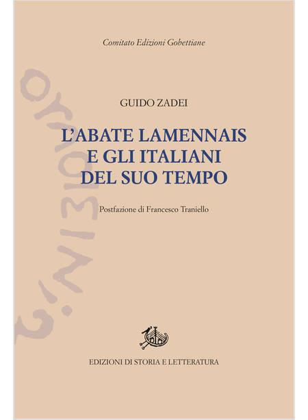 Cattolico bresciano di simpatie moderniste, seguace di Murri e interventista democratico nella Prima guerra mondiale, Guido Zadei (1883-1934) conobbe Gobetti attraverso Augusto Monti. Di Lamennais - cattolico liberale francese approdato poi a posizioni democratico-radicali e sostenitore della libertà di coscienza, insegnamento, stampa e associazione - Zadei mise in rilievo soprattutto la vena separatista e antitemporalista riguardo ai rapporti tra Stato e Chiesa e l'ispirazione evangelica nella richiesta di più eque condizioni per le classi popolari. Il saggio, pubblicato nel 1925, faceva trasparire anche l'opposizione al processo di avvicinamento tra Mussolini e la Chiesa e fu recensito molto favorevolmente da Luigi Sturzo. I successivi lavori di Zadei su Manzoni e Lamennais furono apprezzati da Francesco Ruffini, che ne lodò la figura di storico non accademico. Postfazione di Francesco Traniello.