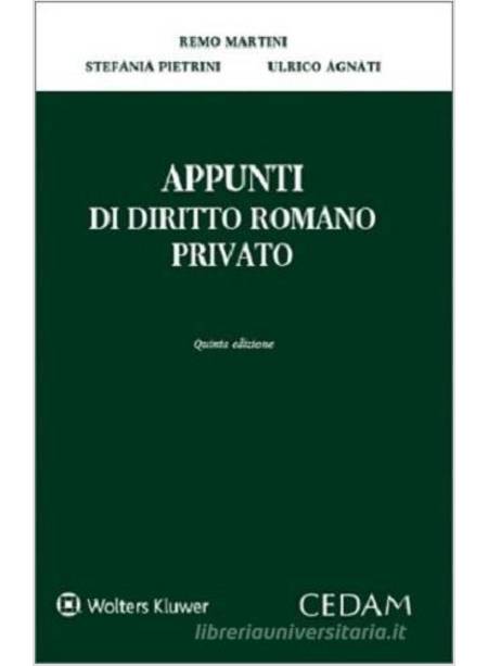 Gli Appunti di diritto romano privato, dopo una nuova approfondita revisione, giungono ora alla quinta edizione sempre per i tipi della CEDAM. Questo manuale espone sinteticamente il diritto romano privato e il suo processo, assumendo come riferimento le due più importanti opere per l'insegnamento predisposte dagli stessi Romani e a noi pervenute: le Institutiones del giurista Gaio del II sec. d.C. e quelle dell'imperatore Giustiniano del VI sec. d.C. Gli Appunti di diritto romano privato seguono la sistematica di tali opere, impostata sulla tripartizione persone-cose-azioni, mettendone in luce i profili espositivi e gli strumenti dialettici, e offrendo una trattazione storicizzata alla ricerca delle radici del moderno diritto privato dei paesi dell’Europa continentale.