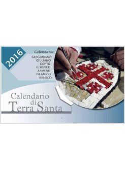 E' il calendario della Custodia di Terra Santa 2016, con nuova veste grafica. Riporta date, festività religiose, ricorrenze particolari e memorie di santi delle principali tradizioni cristiane presenti in Terra Santa, secondo il rispettivo calendario (Gregoriano, Giuliano, Armeno, Copto, Etiopico).
