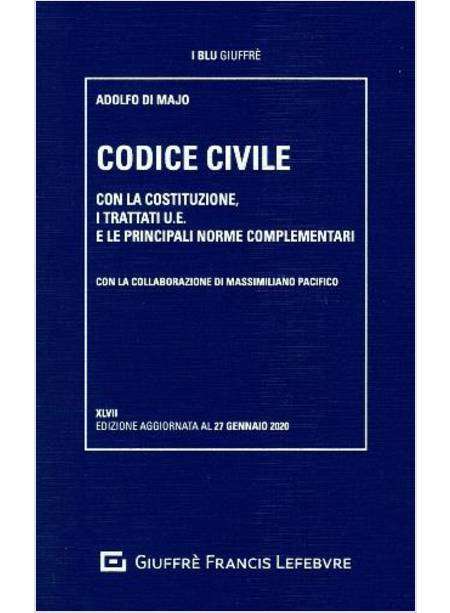 La XLVII edizione del Codice civile, a cura di A. di Majo con la collaborazione di Massimiliano Pacifico, conferma l'impianto collaudato e sempre accolto con favore, che prevede, oltre alle disposizioni del codice civile, un'ampia e accurata selezione di norme complementari, arricchita con le novità legislative più recenti. In particolare, il volume è aggiornato a: d.l. 30 dicembre 2019, n. 162 (decreto "milleproroghe"); l. 27 dicembre 2019, n. 160 (legge di bilancio 2020); d.l. n. 124/2019, convertito in l. n. 157/2019 (decreto "fiscale"). Il d.lgs. 25 novembre 2019, n. 165 (su mercato degli strumenti finanziari), modifica il t.u. sulla intermediazione finanziaria, nella direzione di far assumere al nostro assetto economico, specie nel risparmio privato, carattere finanziario e cioè di investimento in prodotti finanziari. Motivo ispiratore delle modifiche è la tutela di chi investe in prodotti finanziari, onde il loro inserimento nelle parti I e II del t.u. sull'intermediazione: la Parte I, riguardante la funzione di controllo della Consob, in quanto organo competente a vigilare sul rispetto degli obblighi da parte degli intermediari finanziari, nonché la Parte II, recante la disciplina degli intermediari. Alla stregua di tale potenziamento trovano giustificazione le norme, come quella recata dalla modifica dell¿art. 4-sexies comma 2-bis d.lgs. n. 58/1998, ove impone l'osservanza degli obblighi previsti dal Regolamento comunitario n. 1286/2014 anche alle persone che forniscono consulenza su prodotti di investimento assicurativo o vendono tali prodotti; o come quella che sostituisce agli obblighi gravanti sugli intermediari, aventi ad oggetto la notifica del documento recante le informazioni-chiave, modalità invece diventate automatiche di accesso a tali documenti. Quanto infine alle c.d. "offerte fuori sede" dei prodotti finanziari viene imposto sia alle SIM come alle banche e alle imprese di paesi terzi di avvalersi di consulenti finanziari abilitati all'offerta fuori sede. Essi sono equiparati « ai fini della applicazione delle regole di condotta a una succursale costituita sul territorio della Repubblica ». Nel settore del lavoro, l'attenzione si rivolge ai lavoratori autonomi di consegna di beni per conto altrui, in ambito urbano e con l'ausilio di velocipedi o veicoli a motore, così come previsto dal codice della strada. Trattasi, com'è noto, di coloro, la cui tutela non è prevista dal d.lgs. n. 81/2015, sulla disciplina organica dei contratti di lavoro, e che vengono incaricati, da parte di committenti, che usano "piattaforme digitali", di portare pacchi (recanti ad esempio pizze o altro): l'art. 47-bis d.l. n. 101/2019 (convertito in l. n. 128/2019), recante "disposizioni urgenti per la tutela del lavoro e per la risoluzione di crisi aziendali", introduce livelli minimi di tutela, con riguardo al compenso, alle informazioni ad essi dovute e alla copertura assicurativa. Modifiche, da ultimo, vengono apportate dal d.l. n. 104/2019, convertito in l. n. 132/2019 (riordino dei ministeri); e dal d.lgs. 4 ottobre 2019, n. 125 (in materia di nuove disposizioni antiriciclaggio).