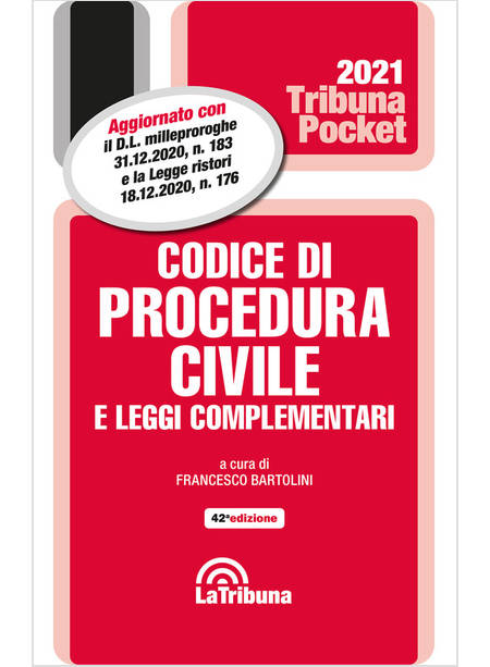 Quest'Opera fornisce ai lettori, in un formato pratico e maneggevole, che ne favorisce la portabilità e la consultazione, il testo aggiornato del Codice di procedura civile e delle principali leggi complementari. La selezione delle leggi complementari comprende materie fra le quali segnaliamo: Locazioni, Matrimonio; Mediazione; Negoziazione assistita; Notificazioni; Responsabilità sanitaria; Semplificazione dei riti civili; Sezioni specializzate in materia di immigrazioni; Tribunale per i minorenni; Tutela dei consumatori.