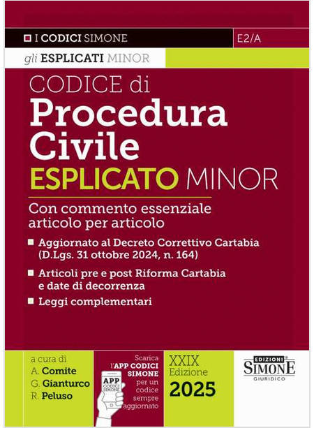 Il Codice di Procedura Civile Esplicato Minor, nel pratico formato tascabile, riporta, per ogni articolo un breve commento che permette una più facile comprensione della norma. Giunto alla ventinovesima edizione, rientra nella collana dei Codici Esplicati Minor che costituiscono un prezioso strumento di studio e lavoro per quanti hanno la necessità di consultare rapidamente un testo codicistico corredato da un agile commento. In calce agli articoli del codice, infatti, sono riportati brevi commenti esplicativi che facilitano la lettura delle singole norme e guidano il lettore verso una immediata comprensione di ciascuna disposizione. In una sezione finale sono poi riportati numerosi Schemi a lettura guidata sui principali argomenti e istituti; a fronte di ogni schema, vengono, inoltre, presentate le definizioni delle parole chiave. A corredo del Codice, l'App CodiciSimone (disponibile gratuitamente per iOS e Android) che permette di consultare gli articoli del codice dalla smartphone e averlo sempre aggiornato in tempo reale. A chi si rivolge questo Codice di Procedura civile Esplicato Minor: agli studenti universitari che vogliono affiancare allo studio del manuale, un codice corredato da brevi note e commenti che facilitano la lettura degli articoli del c.p.c.; a chi affronta la preparazione di un concorso con prove a quiz dove spesso è oggetto di test proprio il dato normativo contenuto nel codice; al professionista che vuole consultare un codice aggiornato e maneggevole ma non vuole rinunciare al corredo di note e commenti seppur essenziali. Questa edizione del Codice di Procedura Civile Esplicato è aggiornata alle ultime novità normative, tra cui il D.Lgs. 31 ottobre 2024, n. 164 (cd. Correttivo).