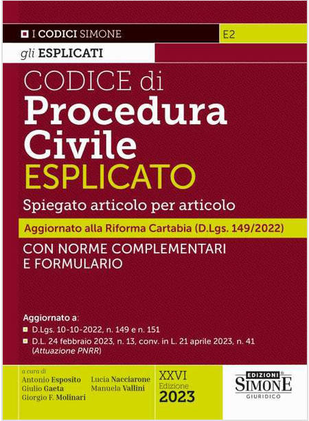 Questa nuova edizione del Codice di Procedura Civile Esplicato è stata profondamente rivista ed aggiornata alla luce della riforma Cartabia del Processo civile (d.lgs. 149/2022) e dell'Ufficio per il processo (d.lgs. 151/2022). La riforma ha disposto modifiche, abrogazioni e sostituzioni di articoli, per ottenere concentrazione e efficienza dei procedimenti, oltre che il rafforzamento delle procedure telematiche. Tra gli interventi più rilevanti vi è la revisione degli strumenti di risoluzione alternativa delle controversie (mediazione finalizzata alla conciliazione, convenzioni di negoziazione e arbitrato), per instillare la prassi di ridurre il ricorso alle sedi giudiziarie. Il riordino del processo di esecuzione ha il fine di far realizzare al creditore il suo diritto, tutelando l'interesse del debitore, coinvolto anche nella fase della vendita diretta del bene sottoposto a pignoramento. Ultimo (ma non meno importante) intervento ha riguardato una materia delicata e diffusa, quale i procedimenti riferiti ai diritti dei minori, delle persone e delle famiglie per il quale è già operativo il procedimento, nel'attesa che si realizzi anche la composizione del nuovo giudice. Tali cambiamenti «epocali» hanno comportato una profonda e pressoché totale revisione del Codice Esplicato e anche alcune scelte: nonostante, per il regime transitorio del d.lgs. 149/2022, il vecchio codice continuerà a valere per tutte le cause pendenti prima del 28 febbraio 2023, in questa edizione si è scelto di esplicare solo il testo normativo aggiornato alla Cartabia, ossia quello effettivamente applicabile ai procedimenti avviati dal 1° marzo 2023.