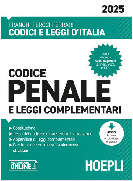 Con le più recenti pronunce della Corte Costituzionale e i principali nuovi provvedimenti di cui si è tenuto conto: - D.lgs. 27 dic. 2024, n. 204: Attuazione della direttiva 2015/849/UE relativa alla prevenzione dell'uso del sistema finanziario a fini di riciclaggio o finanziamento del terrorismo - L. 9 dic. 2024, n. 187: Conversione del D.L. 11 ott. 2024, n. 145, recante disposizioni urgenti in materia di ingresso in Italia di lavoratori stranieri, di tutela e assistenza alle vittime di caporalato, di gestione dei flussi migratori e di protezione internazionale - L. 25 nov. 2024, n. 177: Interventi in materia di sicurezza stradale e delega al Governo per la revisione del codice della strada - L. 18 nov. 2024, n. 171: Conversione del D.L. 1 ott. 2024, n. 137, recante misure urgenti per contrastare i fenomeni di violenza nei confronti dei professionisti sanitari, nonché di danneggiamento dei beni destinati all'assistenza sanitaria - L. 14 nov. 2024, n. 166: Conversione del D.L. 16 set. 2024, n. 131, recante disposizioni urgenti per l'attuazione di obblighi derivanti da atti dell'Unione europea - L. 7 ott. 2024, n. 152: Disposizioni in materia di manifestazioni di rievocazione storica e delega al Governo per l'adozione di norme per la salvaguardia del patrimonio culturale immateriale - D. lgs. 26 set. 2024, n. 141: Disposizioni nazionali complementari al codice doganale dell'Unione e revisione del sistema sanzionatorio - L. 8 ago. 2024, n. 112: Conversione del D.L 4 lug. 2024, n. 92, recante misure urgenti in materia penitenziaria e di giustizia civile e penale.
