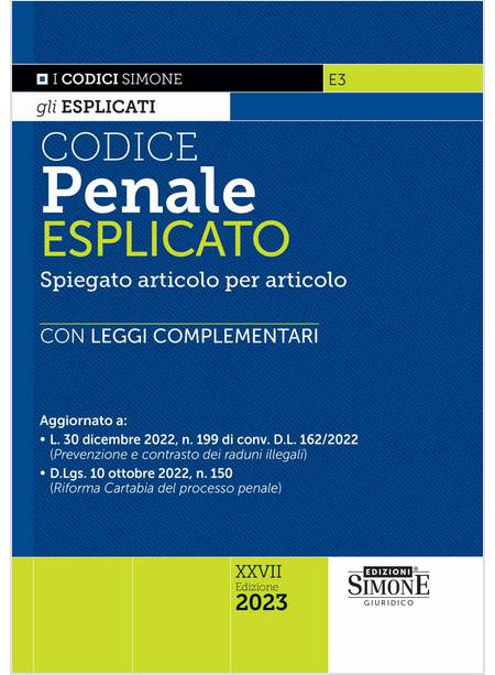 Questa nuova edizione del Codice Penale Esplicato 2023 ha mantenuto inalterata la formula di «esplicazione» per consentire, contestualmente allo studio manualistico, un immediato e costante confronto con le norme codicistiche. Il lavoro, infatti, con l’ausilio degli apparati di commento, si pone l’obiettivo di avvicinare gli studenti universitari al testo normativo nonché di risolvere i dubbi di operatori e cultori del diritto, fornendo gli strumenti necessari per fare il punto sugli istituti del diritto penale attraverso un’analisi della giurisprudenza più recente e della dottrina più significativa.