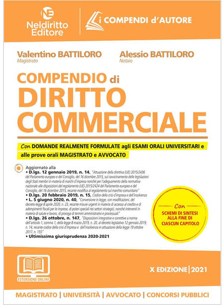 Il "Compendio di diritto commerciale", di Valentino Battiloro e Alessio Battiloro, si inserisce nella collana "I compendi d'autore", destinata a chi si appresta alla preparazione degli esami orali per l'università, per avvocato, per il concorso di magistrato e per i concorsi pubblici. Il volume fornisce una analisi completa e, tuttavia, sintetica e schematica, della disciplina, degli istituti di parte generale e speciale, con segnalazione anche della giurisprudenza più significativa illustrata in appositi Focus. Il Compendio è stato redatto per agevolare una rapida memorizzazione con l'esposizione "per punti" delle principali tesi emerse in dottrina e in giurisprudenza sulle questioni più problematiche: è frequente, inoltre, l'uso di grassetti e corsivi per i concetti-chiave di ogni singolo istituto; consente, infine, di saggiare il livello di preparazione, fornendo, per ciascun capitolo, le domande più probabili e ricorrenti su cui è utile che gli aspiranti avvocati, magistrati, funzionari e dirigenti si esercitino.