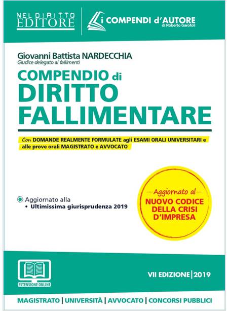 Il Compendio di diritto fallimentare, di Giovanni Battista Nardecchia, si inserisce nella collana “I Compendi d’Autore”, destinata a chi si appresta alla preparazione degli esami orali per l’università, per Avvocato, per il concorso di Magistrato e per i concorsi pubblici.