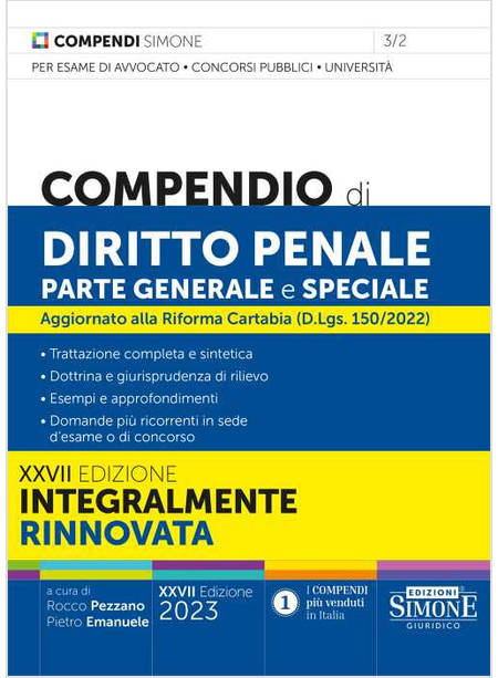 La nuova produzione della collana Compendi Simone del 2023, di cui fa parte il Compendio di Diritto Penale parte Generale e Speciale, è attraversata da una fase di profondo cambiamento nella grafica, nella struttura e nel modo in cui sono trattati gli argomenti. Più di 50 anni fa le Edizioni Simone inventavano i compendi di diritto per l'università. Oggi il metodo tradizionale Simone, teso a unire un'esposizione chiara al rigore scientifico, è stato rivisto alla luce delle rinnovate esigenze dei diversi lettori interessati a questa tipologia di prodotto. Il linguaggio utilizzato è stato così reso più semplice e immediato e gli istituti fondamentali della disciplina sono stati esaminati a partire dalla loro definizione, al fine di individuare subito il primo dato indispensabile per favorire uno studio sistematico. Anche l'aggiornamento legislativo e giurisprudenziale, che caratterizza da sempre i Compendi, è stato rivisto nell'ottica di fornire un immediato risalto. Gli stessi orientamenti della dottrina sono stati rielaborati alla luce della manualistica più diffusa. Nell'esposizione degli argomenti, in alcuni casi, sono stati utilizzati tre elementi didattici, messi in evidenza con diversi corpi di stampa e con apposite icone. In tal modo sono evidenziati gli approfondimenti, per chi intende esaminare e comprendere maggiormente un tema, gli esempi, che consentono di chiarire un concetto, e le differenze, per definire i tratti caratteristici di un istituto in rapporto con altri simili. In chiusura di ogni capitolo del Compendio, infine, sono riportate le schede di sintesi e le domande più ricorrenti in sede di esame o di concorso, in modo da permettere al lettore di verificare immediatamente il livello di preparazione raggiunto. Per tali caratteristiche, il Compendio di Diritto Penale parte Generale e Speciale 2023 si conferma ancora una volta lo strumento di studio indispensabile per chi intende sostenere l'esame di avvocato, un concorso pubblico o preparare un esame universitario.
