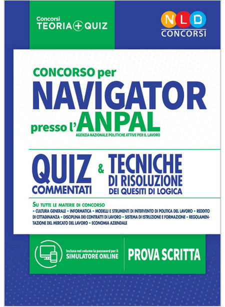 In data 7 marzo 2019, l'ANPAL (Agenzia Nazionale Politiche Attive del Lavoro) ha pubblicato la determina avente ad oggetto la procedura negoziata per l'affidamento del servizio di predisposizione test, organizzazione, gestione e realizzazione della prova scritta per la selezione pubblica per il conferimento di incarichi di collaborazione a supporto dell'organizzazione e dell'avvio del reddito di cittadinanza (introdotto con il D.L. 28 gennaio 2019, n.4): si tratta dei c.d. Navigator, ovvero i "cercatori di lavoro" che avranno il compito di guidare nel mercato delle offerte di lavoro i beneficiari del Reddito di cittadinanza. Lo svolgimento della prova d'esame consiste in una prova scritta, costituita da test a risposta multipla, con 4 opzioni di risposta, sulle seguenti materie: cultura generale; quesiti psicoattitudinali; logica; informatica; modelli e gli strumenti di intervento di politica del lavoro; reddito di cittadinanza; disciplina dei contratti di lavoro; sistema di istruzione e formazione; regolamentazione del mercato del lavoro economia aziendale. Il presente volume costituisce uno strumento per la preparazione alla prova scritta della selezione pubblica. Per ciascuna delle sopraindicate materie, sono presenti numerosi quiz a risposta multipla, molti dei quali commentati. Completa il volume l'innovativo simulatore online con il quale è possibile esercitarsi con batterie di domande a risposta multipla, aventi ad oggetto ciascuna delle materie oggetto del volume, consultabile con apposita password presente nel retro del volume. Utilissima, la sezione relativa alle tecniche di risoluzione dei quesiti psicoattitudinali di logica.