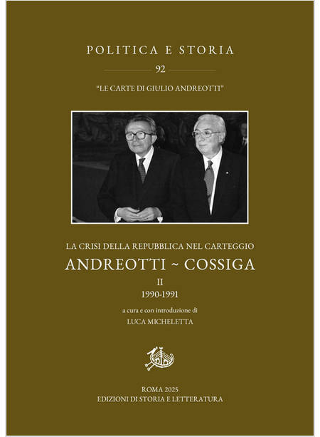 La fitta corrispondenza tra Giulio Andreotti e Francesco Cossiga, pubblicata in questo secondo volume e risalente al periodo tra il 27 settembre 1990 e il 25 luglio 1991, è incentrata sulla crisi del Golfo e sull’operazione Gladio. La preoccupazione principale, a livello internazionale, dei due statisti è l’ultimatum imposto dalle Nazioni Unite all’Iraq di ritirarsi dal Kuwait, che apre la possibilità concreta di un coinvolgimento bellico in Italia. Dal carteggio emerge in particolar modo la figura di Cossiga, che tenta, con avvisi e raccomandazioni al governo, di trovare soluzioni che rendano compatibile la Costituzione e gli impegni militari che il governo è pronto ad assumere. Sul piano interno, stanno invece la polemica su Gladio e le accuse di alto tradimento e attentato alla Costituzione rivolte al presidente della Repubblica. Saranno poi alcune dichiarazioni su Gladio rilasciate da esponenti del governo a turbare maggiormente il quadro istituzionale e a spingere Cossiga, nel dicembre 1990, a minacciare di aprire una crisi istituzionale se Andreotti non avesse assunto una presa di posizione pubblica riguardo Gladio. Tra gli altri argomenti significativi, si legge dell’attacco del PDS nei confronti del capo dello Stato, del referendum per l’abolizione delle preferenze plurime nelle elezioni della Camera e delle origini del messaggio sulle riforme istituzionali inviato da Cossiga nel giugno 1991, in cui si mostrano i dissensi politici e personali con Andreotti e il senso di isolamento da alcuni settori della Democrazia Cristiana. La corrispondenza tutta tra i due statisti, toccando aspetti governativi, umani e istituzionali, restituisce le voci di due tra i maggiori protagonisti della vita politica italiana di quegli anni.