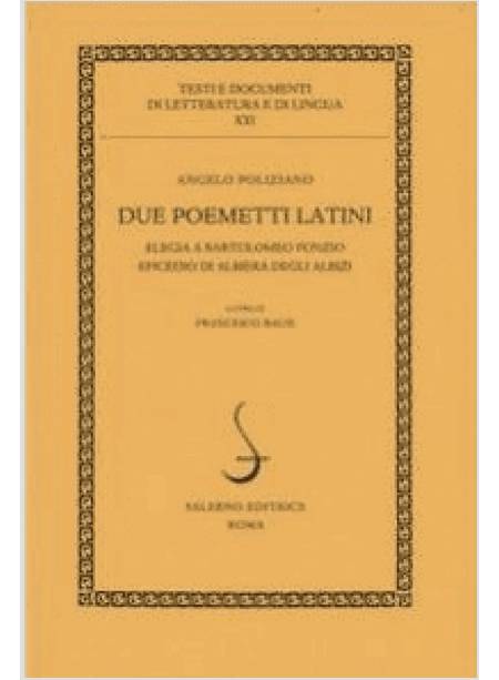 L'"Elegia a Bartolomeo Fonzio" e l'"Epicedio di Albiera degli Albizi", composti verso la fine del 1473, sono le prime grandi prove poetiche di Angelo Poliziano, e si collocano tra i prodotti più significativi della letteratura umanistica del secondo Quattrocento. I due testi rivelano anche il ruolo politico svolto da Poliziano a sostegno della Firenze medicea. L'Elegia e l'Epicedio non avevano fino ad oggi ricevuto adeguate cure filologiche ed esegetiche. Questa edizione critica dei due componimenti è corredata di versione semiritmica e di un commentario erudito; completano il volume un'ampia Introduzione e una dettagliata Nota ai testi. L'edizione dei due componimenti è limitata a 999 esemplari singolarmente numerati.
