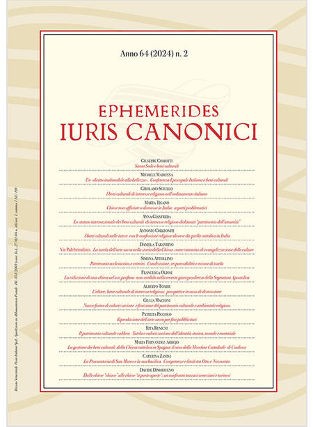 Giuseppe Comotti, Santa Sede e beni culturali Michele Madonna, Un «diritto inalienabile alla bellezza». Conferenza Episcopale Italiana e beni culturali Girolamo Sciullo, I beni culturali di interesse religioso nell'ordinamento italiano Marta Tigano, Chiese non officiate o dismesse in Italia: aspetti problematici Anna Gianfreda, Lo statuto internazionale dei beni culturali di interesse religioso dichiarati "patrimonio dell'umanità": aspetti di rilievo ecclesiasticistico Antonio Chizzoniti, I beni culturali nelle intese con le confessioni religiose diverse da quella cattolica in Italia Daniela Tarantino, Via Pulchritudinis. La tutela dell'arte sacra nella storia della Chiesa come cammino di evangelizzazione delle culture Simona Attollino, Patrimonio ecclesiastico e crimini. Condivisione, responsabilità e misure di tutela Francesca Oliosi, La riduzione di una chiesa ad uso profano non sordido nella recente giurisprudenza della Segnatura Apostolica: la sfida di un bilanciamento possibile tra i diritti del fedele e il can. 1222 Alberto Tomer, L'altare, bene culturale di interesse religioso: prospettive in caso di dismissione.
