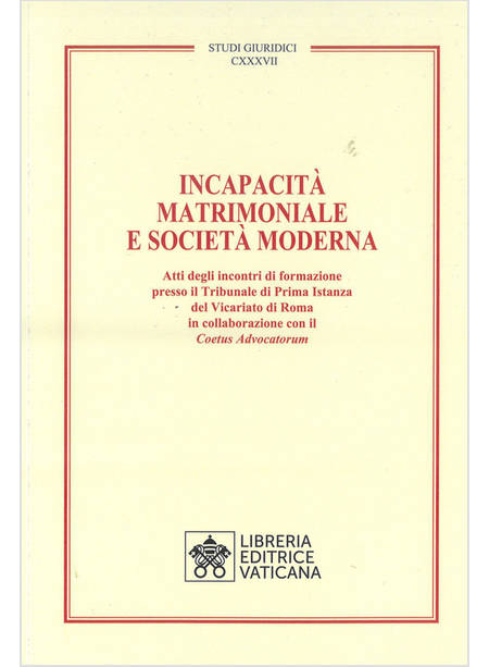 Il Volume raccoglie i contributi degli incontri di formazione organizzati dal Tribunale Interdiocesano di Prima Istanza presso il Vicariato di Roma, in collaborazione con il Coetus Advocatorum nell'anno 2022. L'argomento trattato "Incapacità e società moderna", ha visto l'intervento di autorevoli autori che si sono succeduti declinando la materia trattata secondo aspetti diversi.