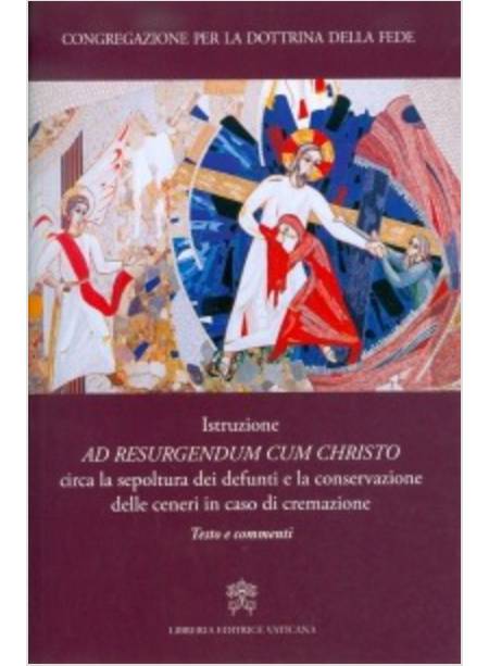 Il presente volume contiene l’Istruzione Ad resurgendum cum Christo circa la sepoltura dei defunti e la conservazione delle ceneri in caso di cremazione, della Congregazione per la Dottrina della Fede (15 agosto2016). Il testo è preceduto da una Presentazione di S.E. mons. Luis Ladaria, S.I., Prefetto, che ne sottolinea sinteticamente i punti salienti.