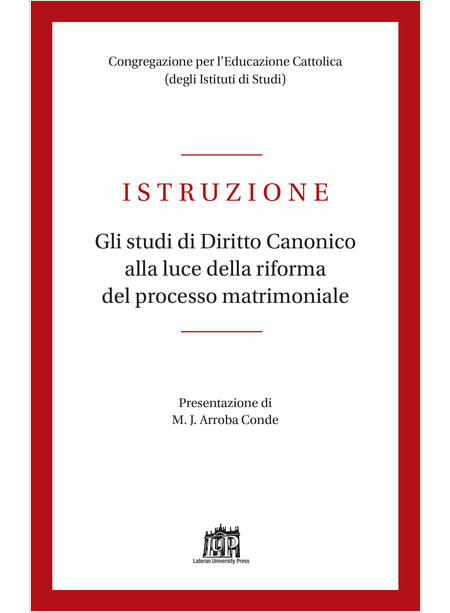 Dopo la Costituzione apostolica Veritatis Gaudium che conferma la disciplina già esistente circa la formazione ordinaria dei futuri canonisti, attraverso i gradi di Licenza e di Dottorato, la recente Istruzione emanata dalla Congregazione per l’Educazione Cattolica si pone nel solco degli indirizzi emersi dalle recenti Assemblee sinodali sulla famiglia, affinché sia facilitato l’accesso agli studi canonistici, potenziando e migliorando così la qualità nella formazione degli operatori dei tribunali ecclesiastici presenti in tutto il mondo. (Dalla Presentazione di Manuel J. Arroba Conde)