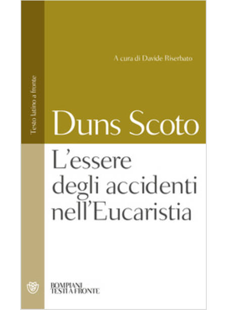 Al centro del trattato sull’Eucaristia di Giovanni Duns Scoto, nel IV libro del suo «Commento alle Sentenze», si trovano incastonate due questioni dedicate all’essere degli accidenti. Esse vantano un notevole interesse teoretico, non soltanto per un’adeguata comprensione della teologia eucaristica del maestro scozzese, ma soprattutto per definire la relazione da lui istituita tra metafisica e teologia, che rappresenta uno dei temi cardine del suo pensiero. È qui offerta la traduzione di tali questioni in cui il Sottile si interroga sullo statuto ontologico degli accidenti, corredata di introduzione, note e apparati. Il volume è curato da Davide Riserbato, docente a contratto di Teologia presso l’Università Cattolica del Sacro Cuore di Milano e professore regolarmente invitato presso la Facoltà di Filosofia della Pontificia Università Antonianum e presso la «Cattedra Marco Arosio di Alti Studi Medievali» dell’Ateneo Pontificio «Regina Apostolorum» (Roma), dove tiene corsi di Storia della filosofia medievale.