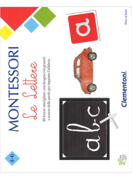 I giochi Montessori - Clementoni propongono alcune attività ispirate al metodo educativo sviluppato da Maria Montessori, scienziata italiana nota in tutto il mondo per il suo contributo in campo pedagogico. Grazie alle tessere smerigliate i bambini toccano la superficie ruvida memorizzando la forma delle lettere. Poi le scrivono sulla lavagnetta e infine le abbinano alle parole. La scatola contiene: 26 tessere con lettere smerigliate; 26 tessere con immagini e parole; lavagna, gessetti e cancellino; Guida con i suggerimenti di gioco. Età di lettura: da 4 anni.