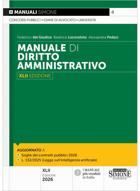 Questa XLII edizione del Manuale di Diritto Amministrativo segue i cambiamenti della materia conciliando una trattazione tradizionale degli istituti giuridici con le novità operative, dal taglio decisamente più moderno. Nel processo di trasformazione un ruolo centrale, infatti, è assolto dal percorso di informatizzazione che sta plasmando il diritto amministrativo, portandolo in una dimensione nuova, in parte inesplorata, nella quale le vecchie regole e i dogmi classici della materia dovranno trovare una nuova modalità applicativa. L’esempio tipico di questa evoluzione è rappresentato dall’intelligenza artificiale, il cui utilizzo nell’esercizio dell’azione amministrativa può dar vita a problematiche nuove, da affrontare secondo principi e tecniche decisamente più adatte. Ma anche altri settori sono in continua evoluzione. Il riferimento è d’obbligo al pubblico impiego e ai contratti pubblici, ambiti del diritto nei quali è maggiore l’impatto del cambiamento. Oltre alla disciplina di riferimento, il testo, come di consueto, è arricchito con i principali orientamenti dottrinali e giurisprudenziali e con le prospettive di riforma. Dal punto di vista normativo, il libro è aggiornato, tra gli altri: — ai nuovi valori economici delle soglie europee nei contratti pubblici, in vigore dal 1° gennaio 2026; — alla L. 23-9-2025, n. 132, Disposizioni e deleghe al governo in materia di intelligenza artificiale; — al D.L. 14-3-2025, n. 25, conv. in L. 9-5-2025, n. 69, Disposizioni urgenti in materia di reclutamento e funzionalità delle pubbliche amministrazioni. Il Manuale di Diritto Amministrativo, per le sue caratteristiche, è rivolto a coloro che devono sostenere concorsi pubblici, l’esame di avvocato nonché esami universitari e costituisce, altresì, un valido strumento per l’aggiornamento professionale.
