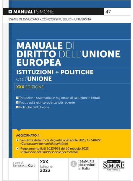 Il Manuale di diritto dell'Unione Europea, giunto alla XXX edizione, offre una trattazione completa della materia, consentendo al lettore di acquisire una conoscenza approfondita della disciplina. Nelle prime quattro parti del libro è riportato il sistema giuridico istituzionale dell'Unione (le istituzioni, le fonti, i rapporti tra l'ordinamento dell'Unione europea e quello degli Stati membri e, in particolare, l'adattamento del diritto italiano alla normativa europea) mentre nelle ultime tre sono illustrate le politiche europee (mercato interno, spazio di libertà, sicurezza e giustizia, politiche interne e azione esterna dell'UE). Il testo, analizzando gli argomenti principali, evidenzia le tematiche di maggiore attualità e le più recenti novità normative e giurisprudenziali nei diversi settori d'intervento dell'Unione. Il Manuale, così strutturato, rappresenta, dunque, un aggiornato e indispensabile strumento di studio per chi deve preparare l'esame di avvocato, un concorso pubblico o un esame universitario, nonché per l'aggiornamento professionale.