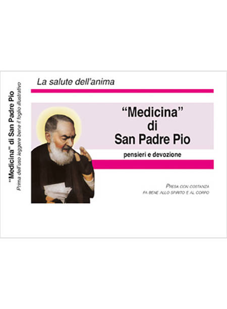 La "Medicina" di Padre Pio contiene: libretto con varie preghiere a san Padre Pio; imaginette; medaglietta.