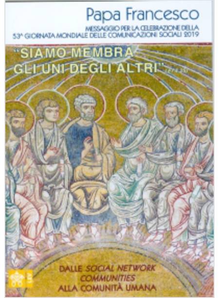 «Siamo membra gli uni degli altri» (Ef 4,25). Dalle community alle comunità. Il tema sottolinea l’importanza di restituire alla comunicazione una prospettiva ampia, fondata sulla persona, e pone l’accento sul valore dell’interazione intesa sempre come dialogo e come opportunità di incontro con l’altro. Si sollecita così una riflessione sullo stato attuale e sulla natura delle relazioni in Internet per ripartire dall’idea di comunità come rete fra le persone nella loro interezza. Alcune delle tendenze prevalenti nel cosiddetto social web ci pongono infatti di fronte a una domanda fondamentale: fino a che punto si può parlare di vera comunità di fronte alle logiche che caratterizzano alcune community nei social network? La metafora della rete come comunità solidale implica la costruzione di un “noi”, fondato sull’ascolto dell’altro, sul dialogo e conseguentemente sull’uso responsabile del linguaggio. Già nel suo primo Messaggio per la Giornata delle Comunicazioni Sociali, nel 2014, Il Santo Padre aveva fatto un appello affinché Internet sia “un luogo ricco di umanità, non una rete di fili ma di persone umane”. La scelta del tema del Messaggio del 2019 conferma l’attenzione di Papa Francesco per i nuovi ambienti comunicativi e, in particolare, per le Reti Sociali dove il Pontefice è presente in prima persona con l’account @Pontifex su Twitter e il profilo @Franciscus su Instagram.