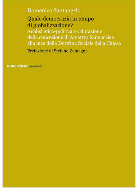 Due sono le domande che strutturano il presente studio, caratterizzato da una stesura articolata di rilievo interdisciplinare: quale democrazia in tempo di globalizzazione? Quale riflessione etico-teologica significativa si può proporre da parte della dottrina sociale della Chiesa per favorire la maturazione del carattere "morale" della democrazia nella globalizzazione? Per rispondere a questi interrogativi, la ricerca verifica il modo in cui i processi di globalizzazione in corso si rapportano alla democrazia attuale, mirando a comprendere se sia possibile contribuire a tracciare un quadro ideale-valoriale di democrazia globale, perché questa tenda ad assumere una configurazione politica reale, rilevante sul piano morale. A tal fine, si assumono, in particolare, gli ultimi insegnamenti pontifici rilevanti sulla materia qui a tema, arricchita dalla comprensione che la proposta etica dell'economista e filosofo indiano Amartya Kumar Sen ha offerto e da valorizzare tenendo conto dei suoi aspetti positivi e di quelli critici, perché più limitati e bisognosi di integrazione. Prefazione di Stefano Zamagni.