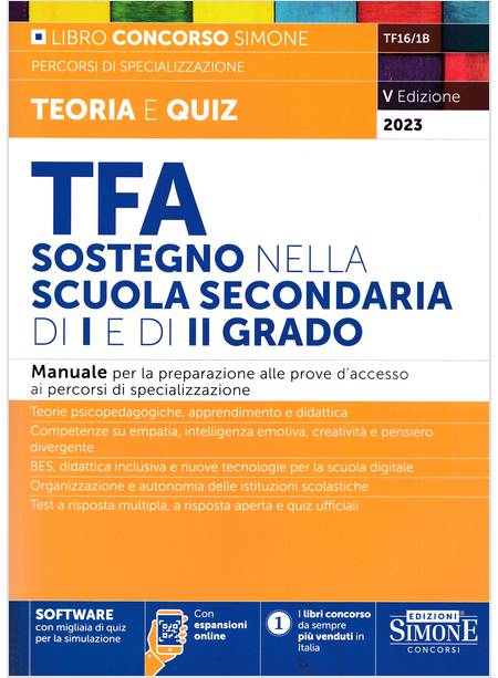 Questo manuale TFA sostegno 2023 Insegnante di sostegno nella scuola secondaria di I e II grado si rivolge a coloro che intendono sostenere le prove per l’accesso ai Corsi di specializzazione per le attività di sostegno nella scuola secondaria e offre un'ampia ed esaustiva trattazione di tutti gli argomenti oggetto delle prove selettive e un'ampia gamma di test.