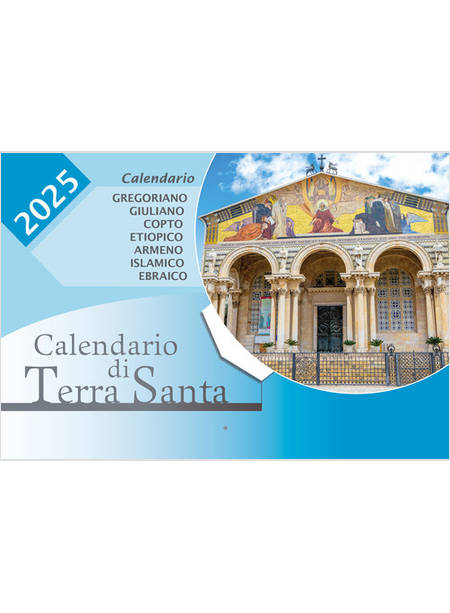 Il classico e imperdibile Calendario della Custodia di Terra Santa. Ogni giorno: mese e giorno del calendario Gregoriano, ricorrenza, fasi lunari, santi e feste del giorno. Le stesse informazioni sono riportate per i calendari Giuliano, Copto, Etiopico, Armeno, Islamico ed Ebraico. Ogni giorno sono riportati gli orari e alcune essenziali informazioni sulle principali celebrazioni che hanno luogo nei santuari di Terra Santa: il Santo Sepolcro a Gerusalemme, la Basilica della Natività a Betlemme, la Basilica dell'Annunciazione a Nazaret, ecc.
