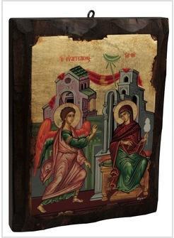 Questa Icona presenta il momento dell'annuncio da parte dell'angelo Gabriele, inviato da Dio a Maria di Nazaret. Il manto rosso porpora, simile alla tenda che proteggeva il Santo dei Santi del Tempio di Gerusalemme, avvolge Maria indicandola quale nuovo tempio di Dio. La madre di Dio è assisa in trono, alle sue spalle l'edificio del tempio e il drappo rosso della protezione divina. Il cielo si apre e lo Spirito Santo discende su Maria simboleggiato attraverso i tre raggi.