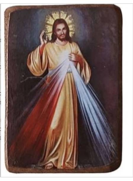 Gesù Misericordioso con la mano destra benedicente e due raggi che fuoriescono dal suo cuore, ricorda il quadro dipinto secondo la richiesta che Gesù avrebbe rivolto a Santa Faustina Kowalska.
