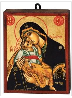 Una delle tipologie classiche delle icone mariane,definita soprattutto dalla posizione guancia a guancia tra la Madre e il Bambino. I fregi dorati sul manto indicano sia la sua regalità che le grazie particolari di cui Maria è stata fatta oggetto. Sulla fronte e sulle spalle (ne è visibile solo una sulla spalla sinistra) tre stelle annunciano la Verginità di Maria prima, durante e dopo il parto. Lo sguardo della Vergine non è rivolto al Bambino, ma a colui che guarda l’icona per introdurlo all’incontro con il Cristo, portatore della buona novella (il rotolo della Parola). Lei è la Mediatrice.