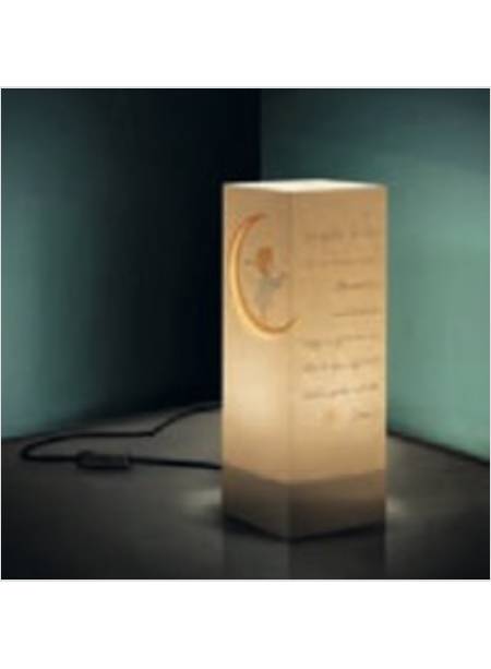 un angioletto in piedi sulla Luna, contornato da piccole stelline. Accendendola comparirà il testo della preghiera Angelo di Dio.