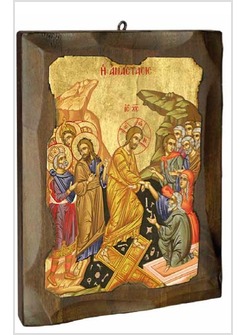 L’icona della Risurrezione (Anastasis) è dominata dalla figura regale (le vesti color oro) del Risorto che, disceso negli Inferi (la caverna), ne risale vittorioso.