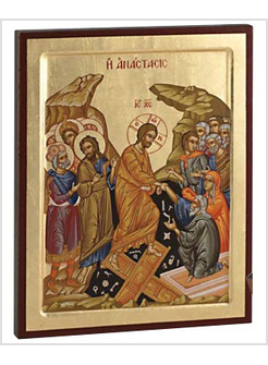 L’icona della Risurrezione (Anastasis) è dominata dalla figura regale (le vesti color oro) del Risorto che, disceso negli Inferi (la caverna), ne risale vittorioso.