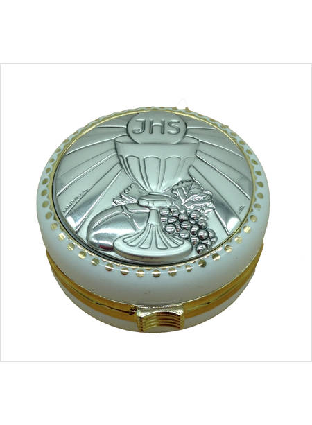 Scatolina portarosario rotonda del diametro di circa 6 cm in polimero bianco e oro con placca in bilaminato d'argento raffigurante i simboli della prima comunione (calice, pane e uva).